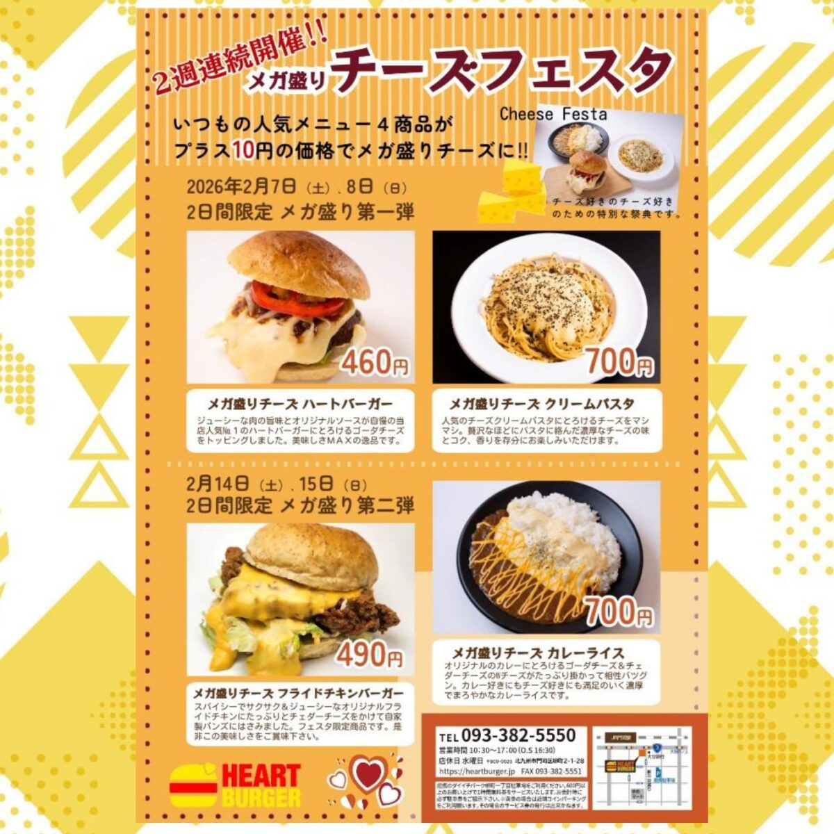 【HEART BURGER】2月7日(土)~2週連続土日開催‼ メガ盛りチーズフェスタ